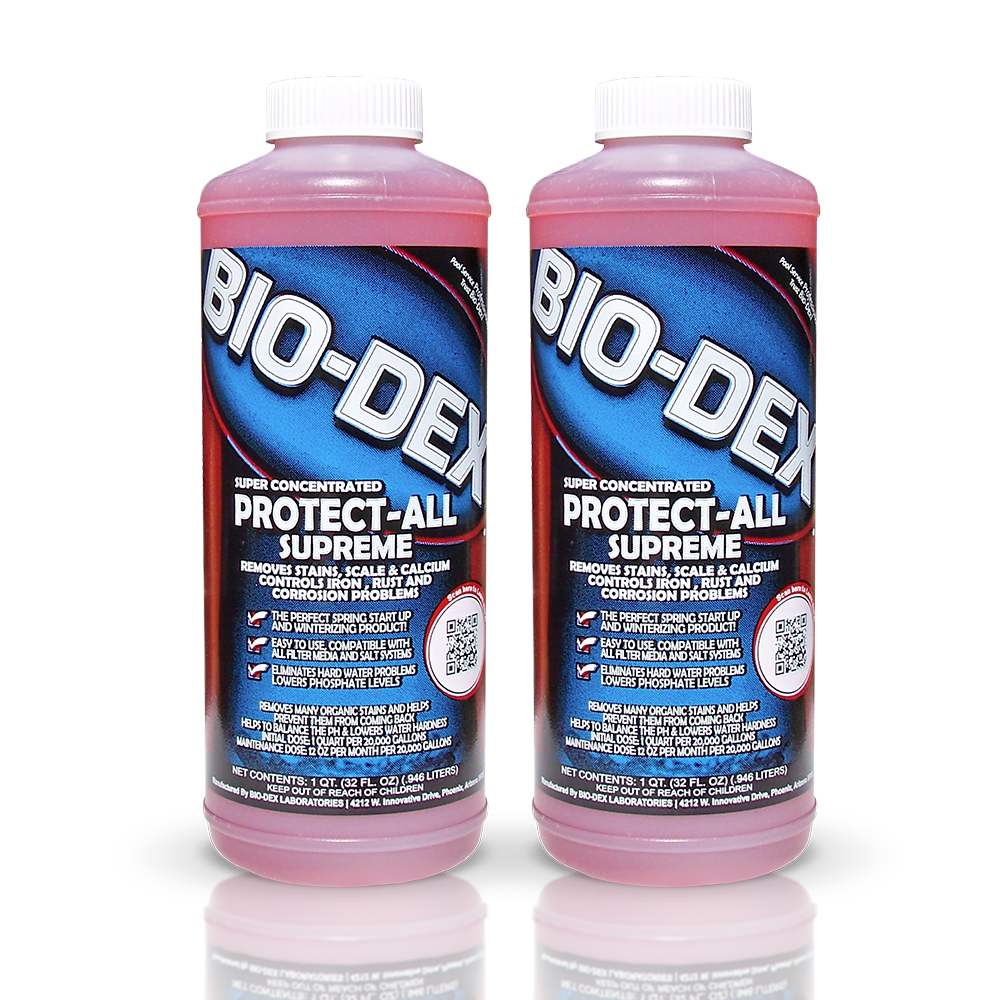 This is the product of choice in areas with hard water problems. It removes many types of organic stains and combined with Aquadex 50 Stain Off will remove 98% of all types of surface stains. The product is an effective tool for new pool startups, newly filled pools, spring pool startup, seasonal winterizing and ongoing maintenance. Protect All Supreme can also be used on spas, hot tubs and decorative pools.