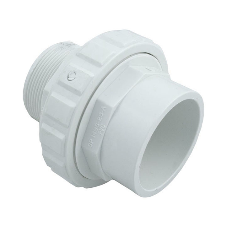 Hayward flush male/female socket union is made of PVC material. Available in white color. It has 2-inch MPT threaded male end and a 2-inch socket slip female end.