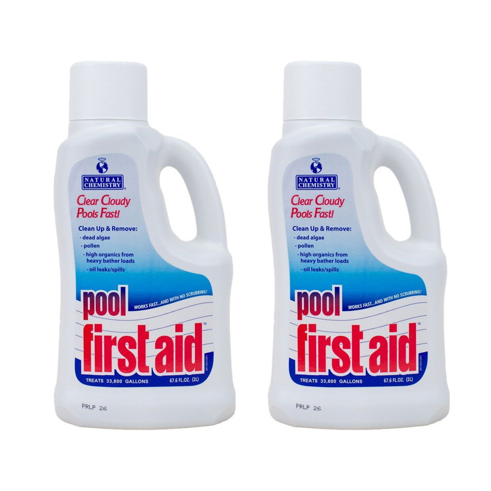 Natural Chemistry Pool First Aid combines powerful, concentrated natural enzymes with a fast acting polymer clarifier to quickly clean and clear pools that have water contamination, a clogged filter, or waterline build-up. Pool First Aid contains Smartzyme technology which quickly and effectively breaks down non-living organics like dead algae, paint, oil, suntan oil, and other agents. The non-toxic, non-irritating, biodegradable formula is powerful and reduces foaming and leaves pool water cleaner and softer. Compatible with all sanitizers, the Pool First Aid can greatly reduce the need for additional chemicals and shocking. Comes in two 2 liter bottles. Dosage: 2 ounces per 1,000 gallons. 1 capful treats 2,000 gallons. Use every two days until water is clear. Do not use immediately before or after shocking and do not shock during this 48 hour period.