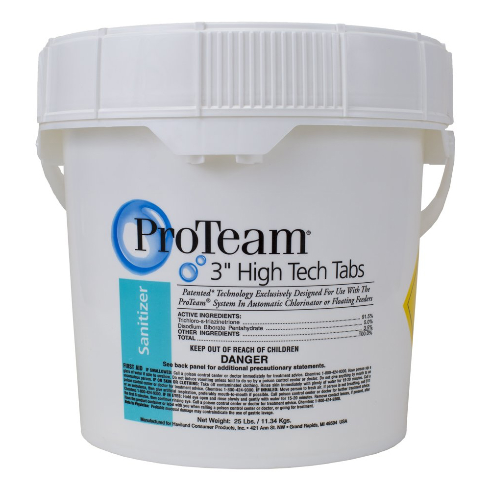 ProTeam 3 Inch High Tech Tabs are stabilized chlorine tablets that are ideal for feeders or floaters, slowly distributing chlorine protection to your pool. Each tablet is shielded against UV rays to stay effective no matter how much the sun shines, while their unique formula requires less water balancing to remain effective. High Tech Tabs even help keep feeders clean by having no binders or gums like substandard competitors. Best of all, 3 Inch High Tech Tabs are made right here in the USA for the highest possible quality, allowing you to buy with confidence. Product Dosage Routine Maintenance: 0.5 oz per 15,000 gallons of water every 2-4 days.