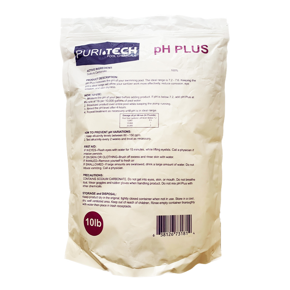 pH Plus increases the pH of your swimming pool. The ideal range is 7.2 - 7.6. Keeping the pH is ideal range helps your sanitizer work more effectively, reduce corrosion, eye irritation, and skin dryness.