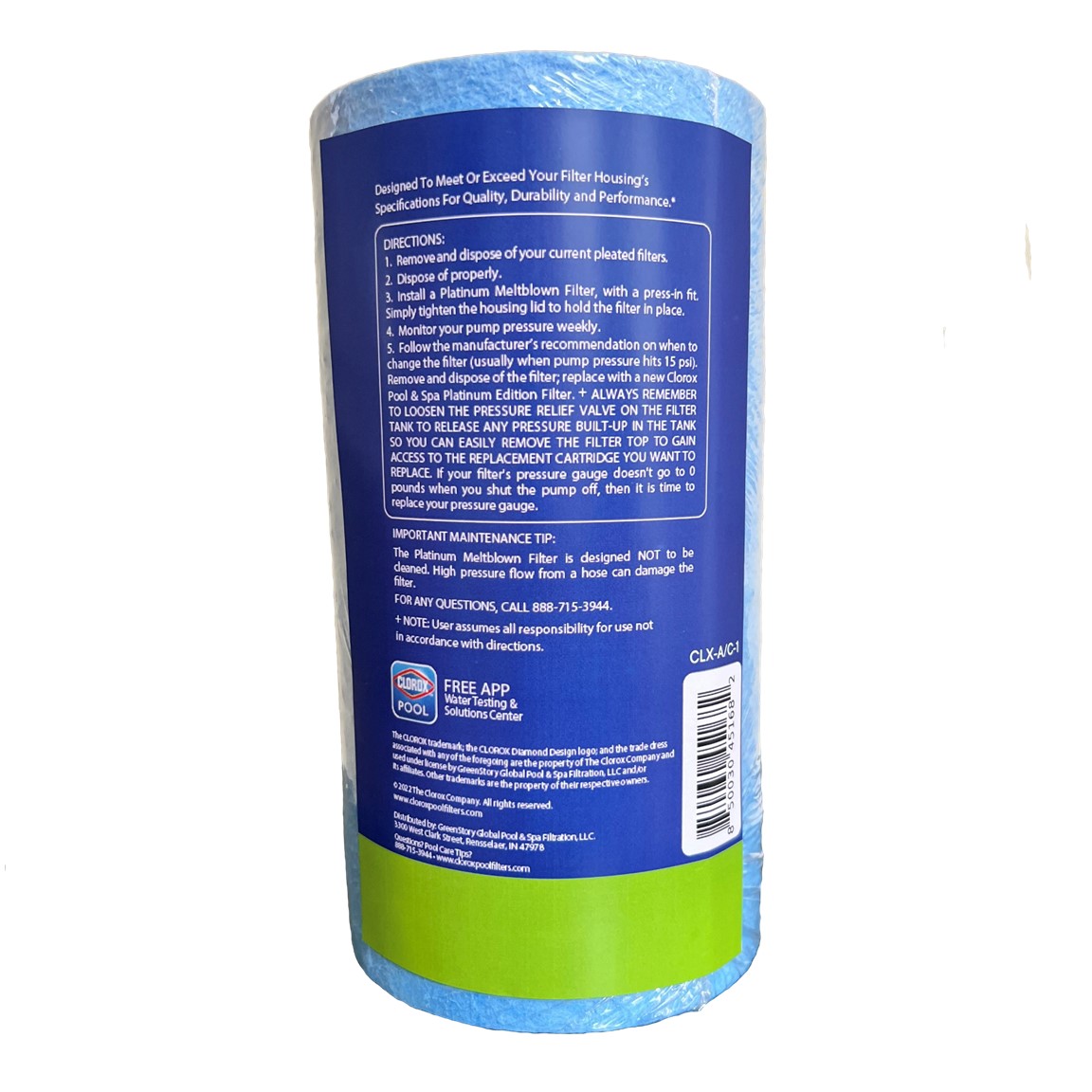 The Clorox™ Pool & Spa Platinum Edition Premium Pool Filters are manufactured to provide the best filtration possible for your pool or spa. With no cleaning necessary, our Made in the USA filter reduces the time you’ll spend on your pool. This groundbreaking filter’s technology is unlike anything found on the market today for pools. Our Platinum Filter removes particulates down to 3-5 microns, leaving your water cleaner and clearer. It comes in 55 sizes to fit most commonly used filter housings, such as Pentair, Hayward, Jandy, Xstream, ClearWater, ProClean, Predator, and Clean & Clear systems. In addition to reduced maintenance time, the filter enhances return flow, improves suction and surface skimming action, forces less pressure on the filter system, enhances overall circulation, enhances chemical distribution, and conserves water and time (due to no monthly cleaning).