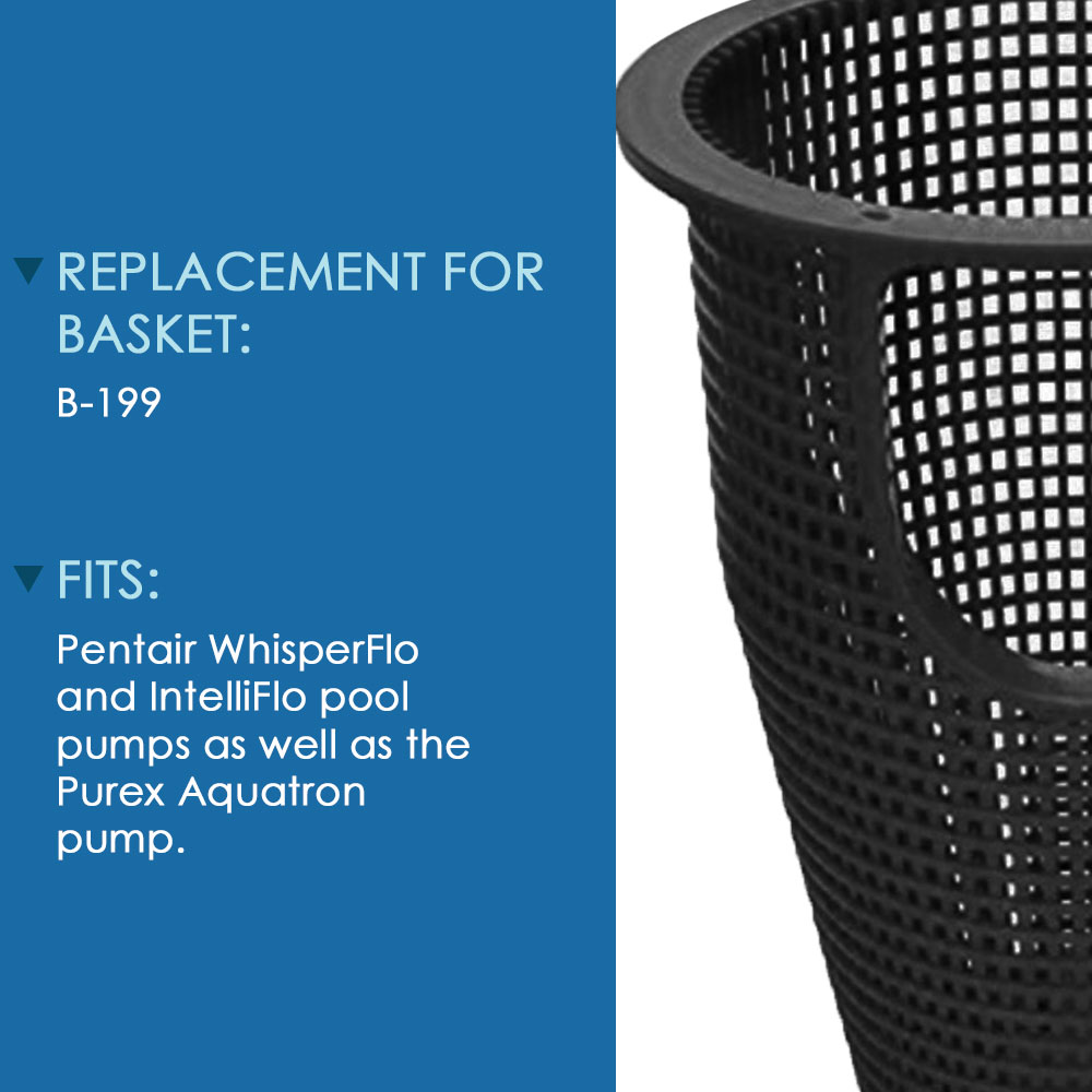 B-199 replacement pump basket replaces the Pentair 070387 Pump Basket and fits the Pentair WhisperFlo and IntelliFlo pool pumps as well as the Purex Aquatron pump. Made of heavy duty ABS material and includes a reinforced rim and four legs to help stabilize the basket. This pump basket is not a Pentair original part but it is made of the same material as the original and always meets the quality of the original basket. -Product Dimensions: 5.73" X 7.8"