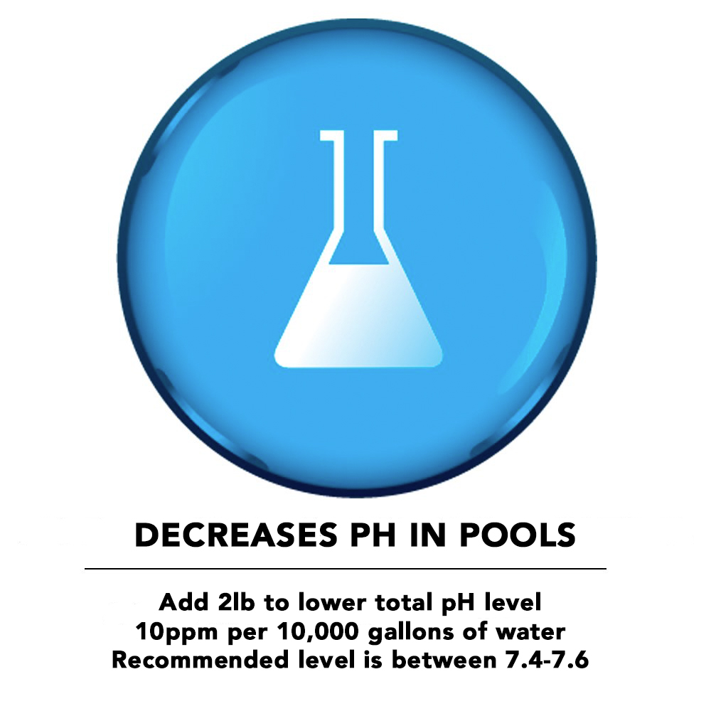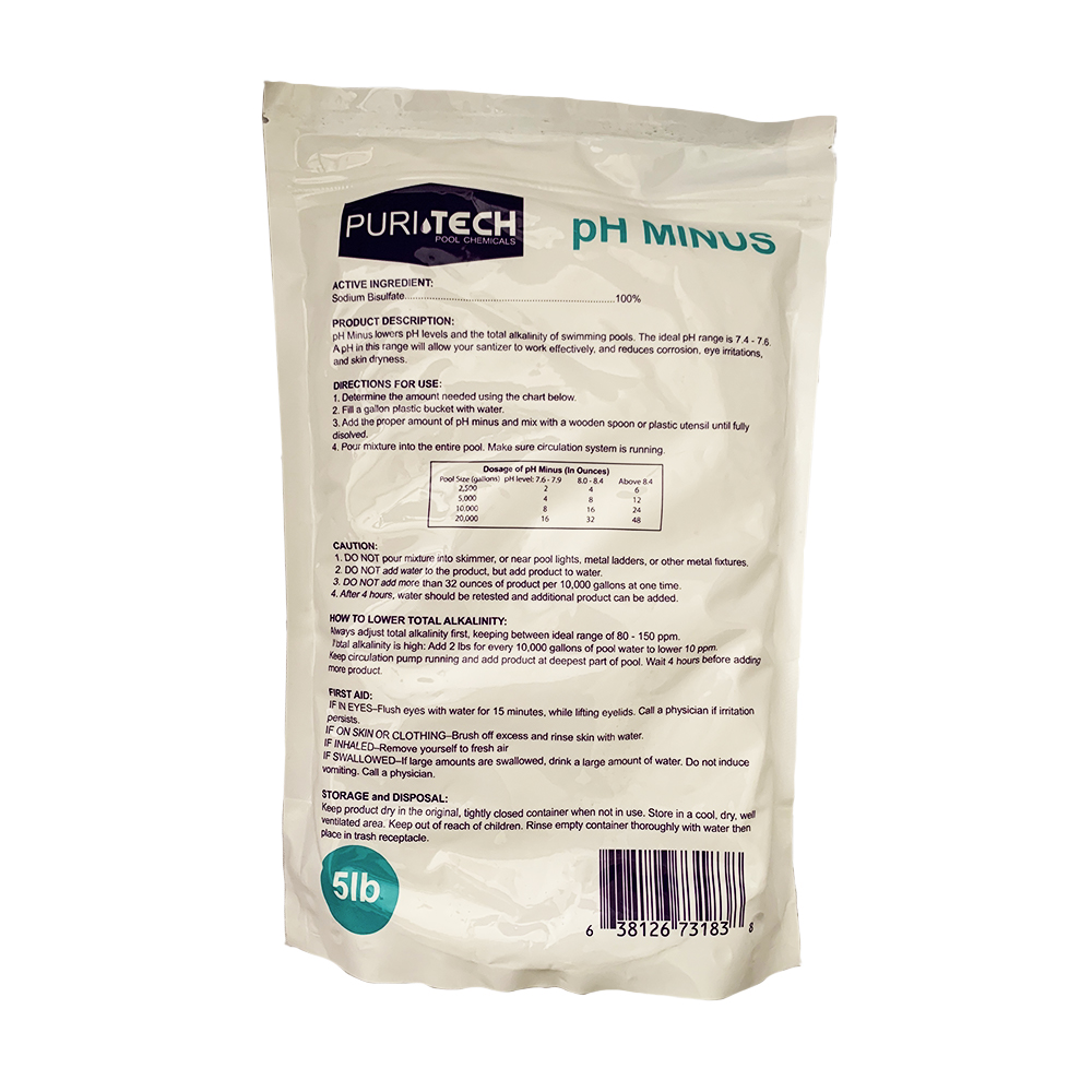 ACTIVE INGREDIENT:Sodium Bisulfate - 100%PRODUCT DESCRIPTION:pH Minus lowers pH level and the total alkalinity. The ideal pH range is 7.4 - 7.6. A pH in this range helps your sanitizer work effectively, and reduces corrosion, eye irritations, and skin dryness.DIRECTIONS FOR USE:1. Determine the amount needed using the chart below.2. Fill a gallon plastic bucket with water.3. Add the proper amount of pH minus and mix with a wooden spoon or plastic utensil until fully dissolved.4. Pour mixture into the entire pool. Make sure circulation system is running. CAUTION:1. DO NOT pour mixture into skimmer, or near pool lights, metal ladders, or other metal fixtures.2. DO NOT add water to the product, but add product to water.3. DO NOT add more than 32 ounces of product per 10,000 gallons at one time.4. After 4 hours, water should be retested and additional product can be added.HOW TO LOWER TOTAL ALKALINITY:Always adjust total alkalinity first, keeping between ideal range of 80 - 150 ppm.If total alkalinity is high: Add 2 lbs for every 10,000 gallons of pool water to lower 10 ppm.Keep circulation pump running and add product at deepest part of pool. Wait 4 hours before adding more product. FIRST AID:IF IN EYES–Flush eyes with water for 15 minutes, while lifting eyelids. Call a physician if irritation persists.IF ON SKIN OR CLOTHING–Brush off excess and rinse skin with water.IF INHALED–Remove yourself to fresh airIF SWALLOWED–If large amounts are swallowed, drink a large amount of water. Do not induce vomiting. Call a physician.STORAGE and DISPOSAL:Keep product dry in the original, tightly closed container when not in use. Store in a cool, dry, well ventilated area. Keep out of reach of children. Rinse empty container thoroughly with water then place in trash receptacle.