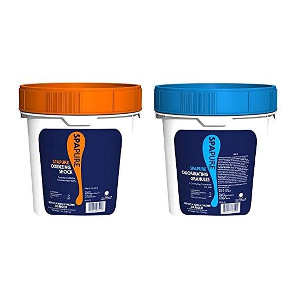 SpaPure Chlorinating Granules Chlorinating Granules is fast acting in water. Features Effective Chlorine Treatment Long Lasting Benefits Effectively cleans the spa and clarifies cloudy water. Dissolves rapidly in water. Easy to use product that can be used to clean and shock. Perfect for smaller spas or spas with sporadic use. Applications Apply to the spa while the water is circulating After filling or when using to super chlorinate shock your spa. Add 1 ounce for every 500 gallons of water to the spa Maintenance: Add as needed to maintain 1 to 3 ppm of chlorine SpaPure Spa Oxidizing Shock Over time, spa water can look dull and the chemicals in the water don’t work as well as they should. Use Spa Oxidizing Shock as a fast acting, quick dissolving, non-chlorinated oxidizing treatment. Benefits No pre dissolving necessary. Spa entry can occur shortly after adding it to the water. Applications Apply to the spa while the water is circulating. Apply three tbs for every 250 gallons directly to the water. Typically add this product weekly or more frequently if the spa is used often. Made in the USA.