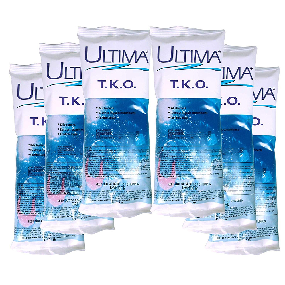 Ultima T.K.O. is a fast acting, quick-dissolving multi-purpose pool shock that sanitizes, clarifies, prevents algae and shock treats your pool. Customers love how quickly Ultima T.K.O. works. A 73% Cal Hypo pool shock, one easy-to-use 1 lb. pouch treats 15,000 gallons, destroying bacteria quicker than any other shock. T.K.O. shock provides powerful protection against stubborn algae blooms all season long, creating safe and clean pool water. Great for spring start-ups. 73% Calcium Hypochlorite. 6 pack